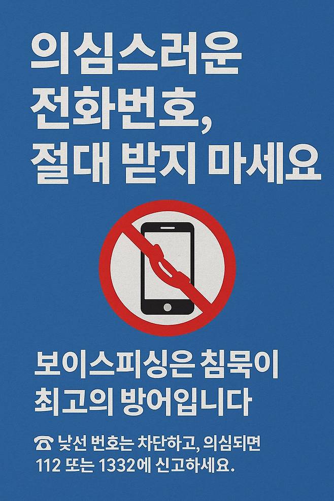 | ▲ 보이스피싱 예방 포스터 ‘침묵이 최고의 방어’라는 문구와 함께 낯선 번호 차단 및 신고를 권장하고 있다. |