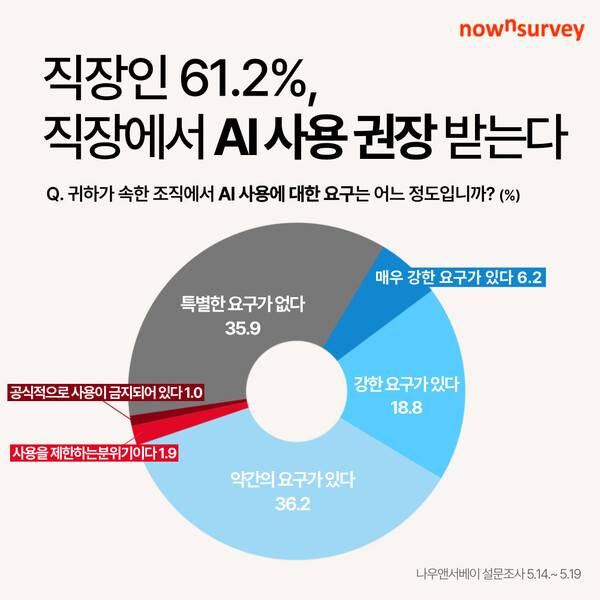 이는 2023년 6월 나우앤서베이의 동일 조사에서 '직장에서 AI사용을 권장한다'는 응답(37%)에 비해, 2년 만에 24%p 증가한 수치다. 이는 AI가 업무 생산성에 실질적으로 기여하고 있다는 인식이 확산된 결과로 해석된다.