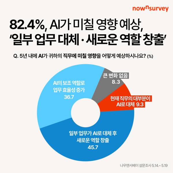 '향후 5년 내에 AI가 귀하의 직무에 미칠 영향은 어떠할 것으로 예상하시나요?'라는 질문에 '일부 업무가 AI로 대체되고 새로운 역할이 생길 것이다'(45.7%)라는 응답이 가장 많았다. 다음으로 'AI가 보조 역할을 하며 업무 효율성을 높일 것이다'(36.7%), '현재 직무의 대부분이 AI로 대체될 것이다'(9.3%) 순이었고, '큰 변화가 없을 것이다'라는 응답은 8.3%에 불과했다.