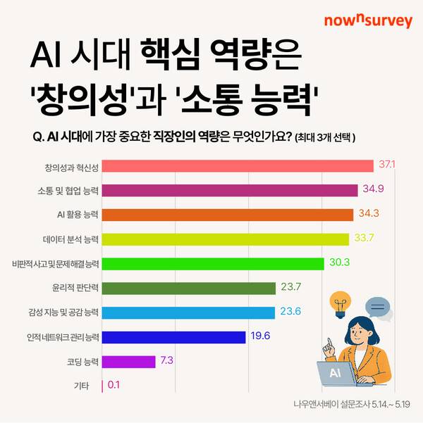 'AI 시대에 가장 중요하다고 생각하는 직장인의 역량은 무엇인가요?'라는 질문에 대하여 응답자들이 가장 많이 꼽은 것은 '창의성과 혁신성'(37.1%)이었고, '소통 및 협업 능력'(34.9%), 'AI 활용 능력'(34.3%), '데이터 분석 능력'(33.7%) 등이 뒤를 이었다. 이는 AI 도구·데이터 활용 능력과 함께 창의성, 소통 및 협업 능력 등 인간 고유의 감성과 소통 능력의 중요성이 부각되고 있음을 시사한다.