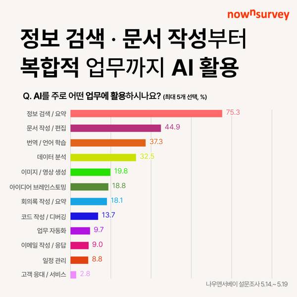 직장인들이 AI를 활용하는 목적은 '정보 검색/요약'(75.3%)이 가장 높은 비율을 차지했다. '문서 작성/편집'(44.9%), '번역/언어 학습'(37.3%), '데이터 분석'(32.5%) 등이 주를 이루었다. 또한 '이미지·영상 생성'(19.8%), '아이디어 브레인스토밍'(18.8%) 등 창의적이고 복합적인 업무에도 AI 활용이 확산되는 추세다.