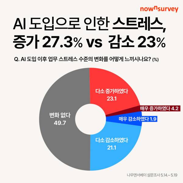 AI 도입 이후 스트레스가 증가했다는 응답은 27.3%, 감소했다는 응답은 23.0%로 나타났다. 절반에 가까운 49.7%는 '변화 없음'이라고 응답했다. AI가 업무 환경과 직장인의 정서에 미치는 영향이 양면적으로 나타났다.