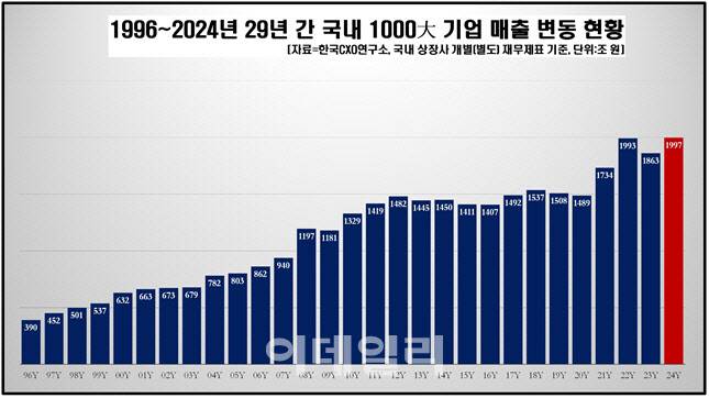 주요 연도별 국내 상장사 1000대 기업의 매출 규모를 살펴보면 1996년에는 390조원 수준이었다. 2008년(1197조원)에 매출 1000조원 시대를 열었다. 지난해 매출이 1997조원으로 2000조원대를 넘어서지 못하며, 국내 1000대 기업은 2008년부터 17년째 매출 1000조원대를 기록 중이다.