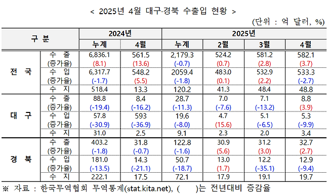 한국무역협회 대구경북지역본부가 발표한 '2025년 4월 대구·경북 수출입 동향 보고서'를 보면 4월 대구의 수출은 전년 동기 대비 3.9% 증가한 8억 8천만 달러로 집계됐습니다.