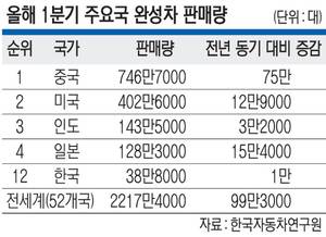 중국에 이어 미국(402만6000대)·인도(143만5000대)·일본(128만3000대) 등에서 많은 차가 팔렸고, 한국(38만8000대)은 12위에 이름을 올렸다.
