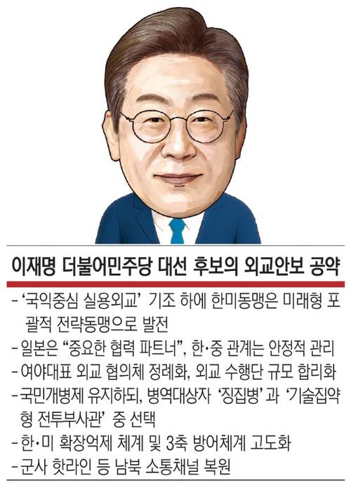 이 후보는 이날 SNS에 올린 외교·안보 공약에서 “실용외교는 굳건한 한미동맹을 토대로 한다”며 “불법계엄으로 훼손된 한미동맹의 신뢰기반을 복원하고 미래형 포괄적 전략동맹으로 발전시키겠다”고 밝혔다. 일본은 ‘중요한 협력 파트너’로 규정하면서 과거사·영토 문제 등은 원칙적으로, 사회·문화·경제 영역은 전향적·미래지향적으로 접근하는 투트랙 대응으로 한·일관계를 다지겠다고 말했다. 그동안의 ‘친중·친북’ 이미지에서 탈피하고 한·미·일 안보동맹을 기본축으로 중·러를 관리하겠다는 구상이다.