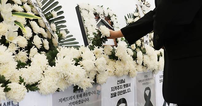 | ▲ 24일 제주도교육청에 마련된 분향소에서 학생 가족의 민원에 시달리다 숨진 제주 모 중학교 교사를 추모하는 사람들의 발길이 이어지고 있다. |