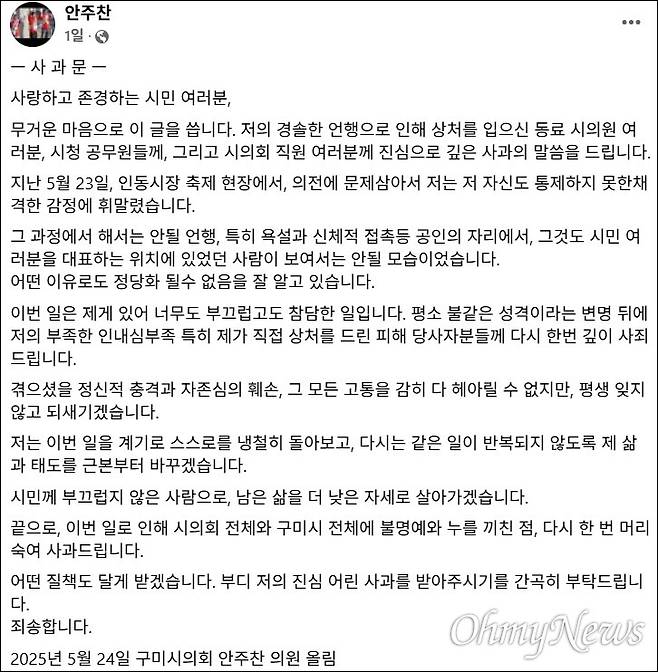 | ▲ 지난 23일 지역 행사에서 의전에 불만을 품고 동료 시의원과 실랑이를 벌인 후 공무원을 폭행한 안주찬 구미시의원이 24일 자신의 SNS에 사과문을 올렸다. |