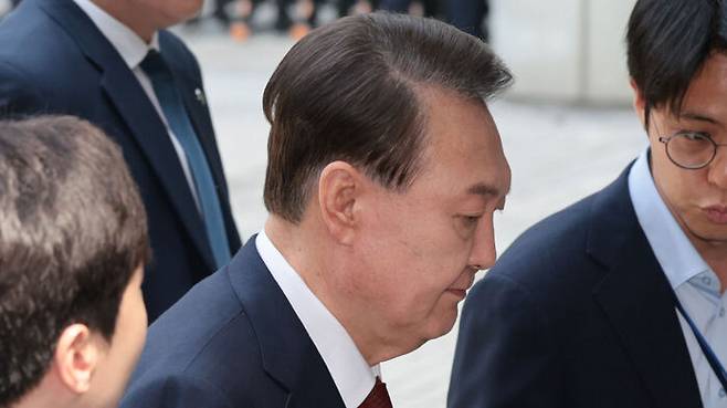 윤석열 전 대통령은 오늘 내란 혐의 재판에 지상 출입구로 출석하면서 취재진 질문에 답변 없이 법정으로 직행했습니다.