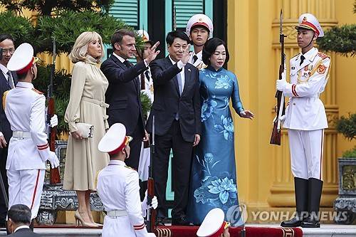 epa12135972 Vietnam's President Luong Cuong (C) and his wife, Nguyen Thi Minh Nguyet (2-R), and French President Emmanuel Macron (C-L) and his wife, Brigitte Macron (2-L), attend the welcome ceremony at the Presidential Palace in Hanoi, Vietnam, 26 May 2025. EPA/Chalinee Thirasupa / POOL