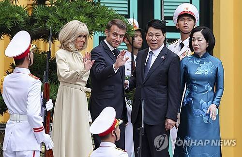 Vietnam's President Luong Cuong and his wife Nguyen Thi Minh Nguyet welcome French President Emmanuel Macron and his wife Brigitte Macron at the Presidential Palace in Hanoi, Vietnam, Monday, May 26, 2025. (Chalinee Thirasupa/Pool Photo via AP) RETRANSMISSION FOR ALTERNATE CROP OF PLHK104. POOL PHOTO