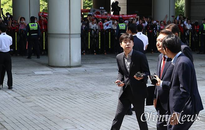 이날 오전 10시경 윤씨는 서울중앙지방법원 서관 앞에서 차에서 내렸다. 가지런한 2 대 8 가르마, 짙은 남색 계열의 정장에 붉은색 넥타이까지, 지난 두 차례 지상 출입(12일, 19일) 때와 똑같은 모습이었다.