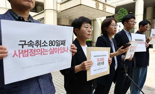 잠시 후 참여연대와 민주사회를위한변호사모임, 군인권센터는 "증거인멸의 염려가 여전히 존재한다"며 시민 3만6330명의 서명이 담긴 '윤석열 재구속 촉구 의견서'를 법원에 접수했다.