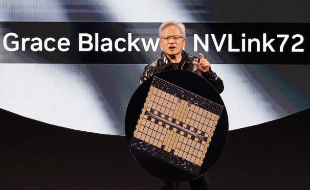 [세계 최대 가전·정보기술(IT) 전시회 CES 2025 개막을 하루 앞둔 지난 1월 6일 미국 네바다주 라스베이거스 만달레이베이 컨벤션센터 내 미셀로브 울트라 아레나(Michelob Ultra Arena)에서 젠슨 황 엔비디아 최고경영자(CEO)가 기조연설하고 있다. (사진=연합뉴스)]