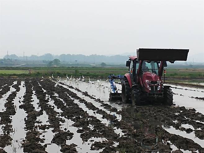 | ▲ 백로와 농사짓는 농부 모내기를 위해 써레질을 하는 트랙터 뒤를 백로류가 따라다니고 있다. |