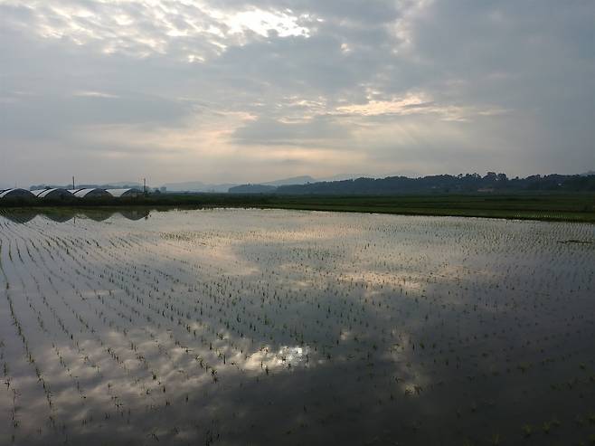 | ▲ 하늘을 품은 논 모내기철 마정벌판 논은 온 산천과 생명과 하늘까지 품는다. 황금벌판과 자웅을 겨루는 멋진 풍광이다. 그러나 아름다움은 구경꾼몫, 농사꾼에게는 피땀의 결과이다. |