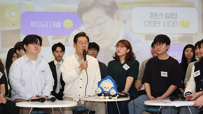 ▲ 더불어민주당 이재명 대선 후보가 26일 경기 수원시 영통구 아주대학교 혁신공유라운지에서 청년 정책을 논의하기 위해 대학생들과 간담회를 하고 있다.