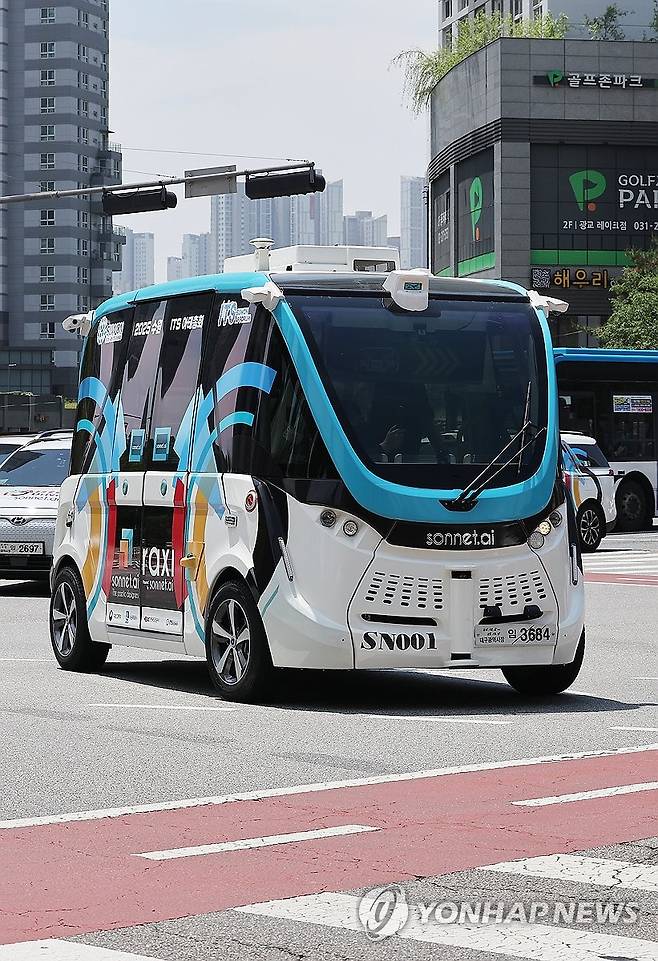 (수원=연합뉴스) 홍기원 기자 = 26일 경기도 수원시 영통구 수원컨벤션센터 인근에서 자율주행차량이 시험운행을 하고 있다.