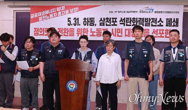 이날 기자회견에 참석한 김은형 민주노총 경남본부장은 "화석연료에서 공공 재생에너지로의 정의로운 전환은 기후위기에 대응하는 동시에 모두가 함께 살아가기 위한 길"이라며 "발전 노동자의 고용을 보장하고 지역민이 함께 살 수 있는 대책이 필요하다"고 말했다.