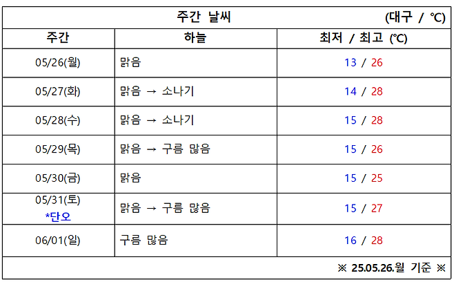 5월 5주 차 아침 기온 13도에서 16도, 낮 기온 25도에서 28도 예상됩니다.