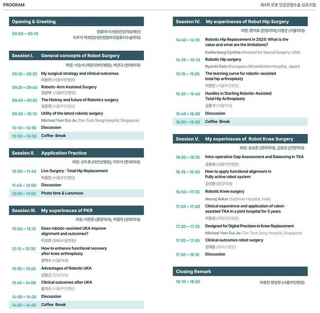 이번 심포지엄에서는 미국, 일본, 인도, 싱가포르 등 해외 연자들이 참여해 세계 각국의 로봇 인공관절수술 최신 현황을 공유하고, 국내외 정형외과 로봇 수술 전문가들이 총 5개 세션, 19개 강의를 통해 무릎과 고관절 분야의 임상 경험과 수술 노하우를 소개할 예정이다.