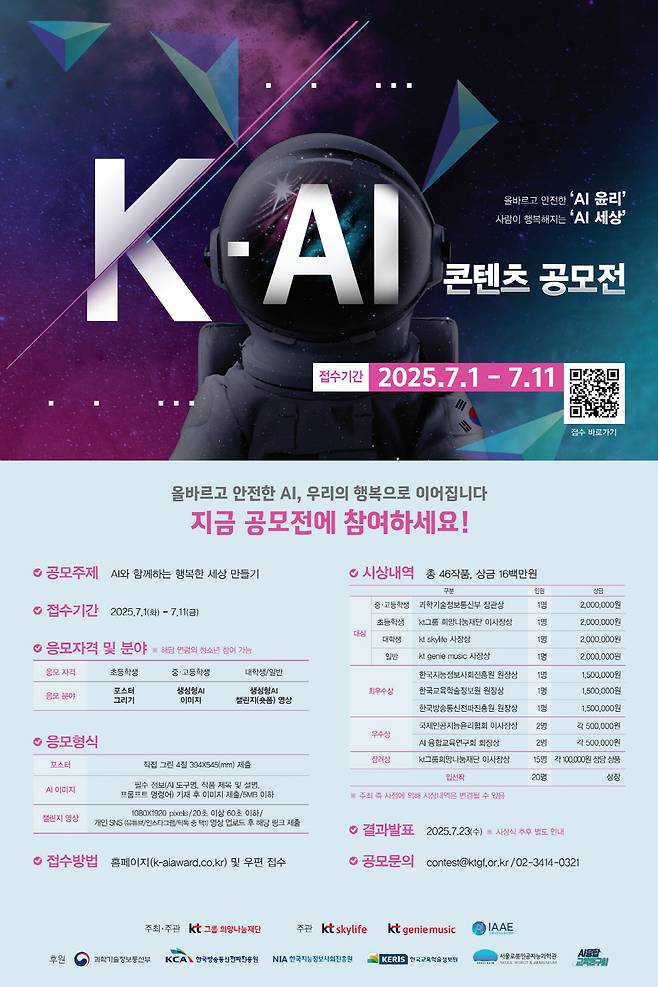 공모 주제는 'AI와 함께하는 행복한 세상 만들기'다. 참가 접수는 7월 1일부터 7월 11일까지 공모전 홈페이지 및 우편을 통해 가능하다. 초·중·고등학생부터 대학생 및 일반인까지 참가할 수 있으며, 참가 구분에 따라 직접 그린 포스터, 생성형 AI 이미지 또는 생성형 AI 챌린지(숏폼) 영상을 제출하면 된다. 수상작은 총 46작을 선정, 총 1600만원 규모의 상금 및 상품을 포함한 다양한 상훈을 수여한다. 대상 수상자(4명)는 참가 구분에 따라 과학기술정보통신부 장관상, KT그룹 희망나눔재단 이사장상, KT스카이라이프 사장상, KT지니뮤직 사장상과 함께 각 200만원의 상금을 받는다. 수상 결과는 7월 23일 공모전 홈페이지에서 발표한다.