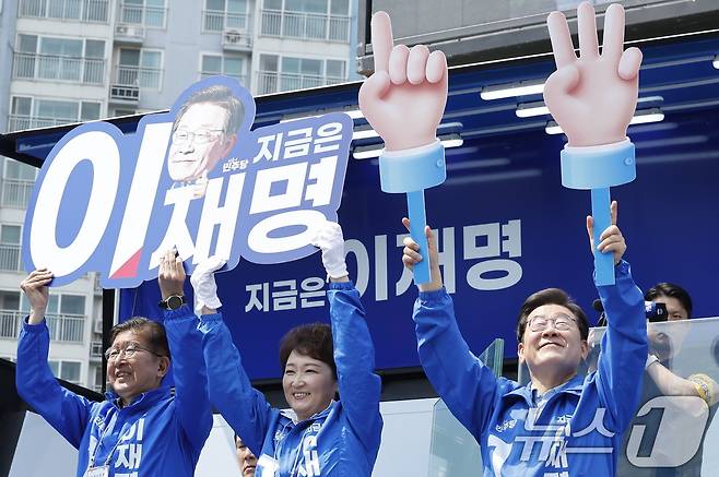 (용인=뉴스1) 안은나 기자 = 이재명 더불어민주당 대통령 후보가 26일 오후 경기 용인시 단국대학교 죽전캠퍼스 정문 앞을 찾아 123캠페인을 하고 있다.