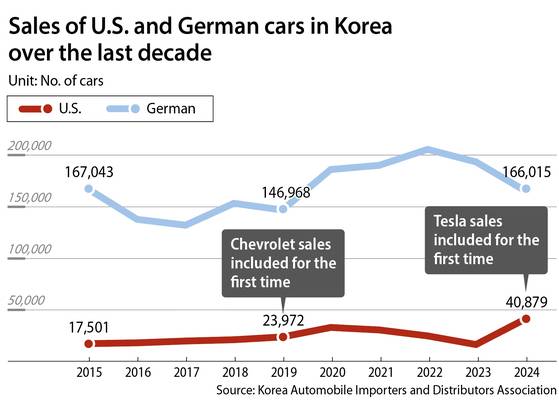 American carmakers sold 40,879 vehicles in Korea in 2024, just 15 percent of the overall foreign car market, according to data from the Korea Automobile Importers and Distributors Association.