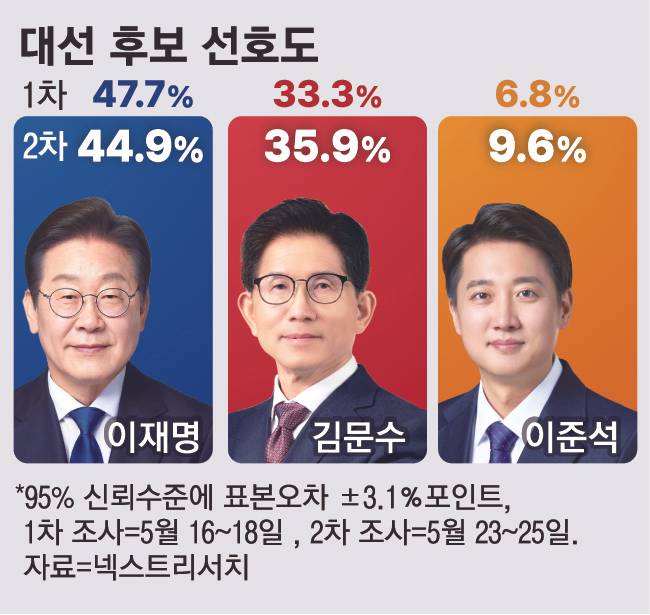 - 이재명 44.9% 김문수 35.9% 이준석 9.6%···중도층 이탈에 李 ‘주춤’ [매경·MBN 대선 여론조사] - 매