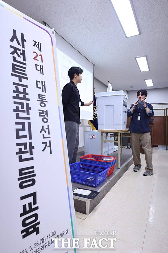 [더팩트ㅣ남용희 기자] 제21대 대통령 선거 사전투표일을 사흘 앞둔 26일 오후 서울 중랑구 선거관리위원회에서 대선 사전 투표 관리관 교육이 진행되고 있다.