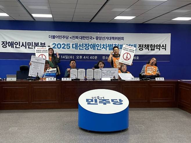 | ▲ 전국장애인차별철폐연대?전국탈시설장애인연대 등 장애인 단체들로 구성된 2025대선장애인차별철폐연대는 지난 14일 더불어민주당 중앙선거대책위원회 장애인시민본부와 정책협약을 체결했다. |