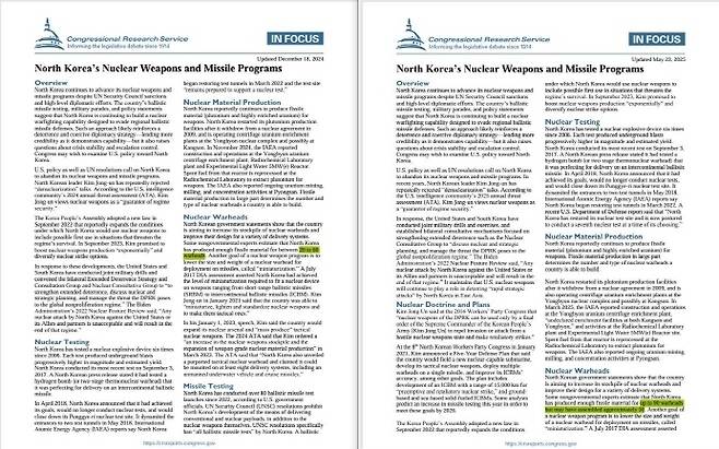 [미국 의회조사국(CRS)이 낸 '북한의 핵무기와 미사일 프로그램 계획' 보고서의 2024년 12월 18일 버전(왼쪽)과 2025년 5월 23일 버전(오른쪽) 캡처. 내용은 대동소이하지만 북한이 생산한 핵분열 물질의 분량 추정치와 조립한 탄두 수 추정치 등 일부 업데이트되거나 추가된 부분이 있다. (CRS 홈페이지 공개 보고서 캡처=연합뉴스)]