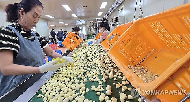 (제주=연합뉴스) 김호천 기자 = 26일 제주 서귀포시 대정농협이 공개한 유통센터 내 깐마늘 생산 작업 모습. 2025.5.25