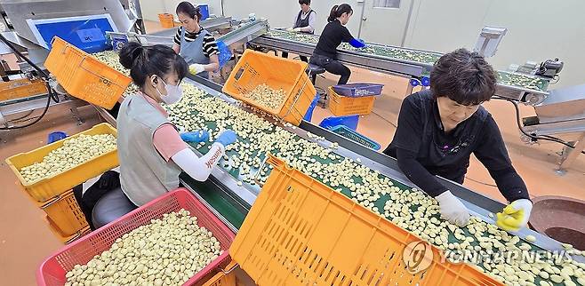 (제주=연합뉴스) 김호천 기자 = 26일 제주 서귀포시 대정농협이 공개한 유통센터 내 깐마늘 생산 작업 모습. 2025.5.25