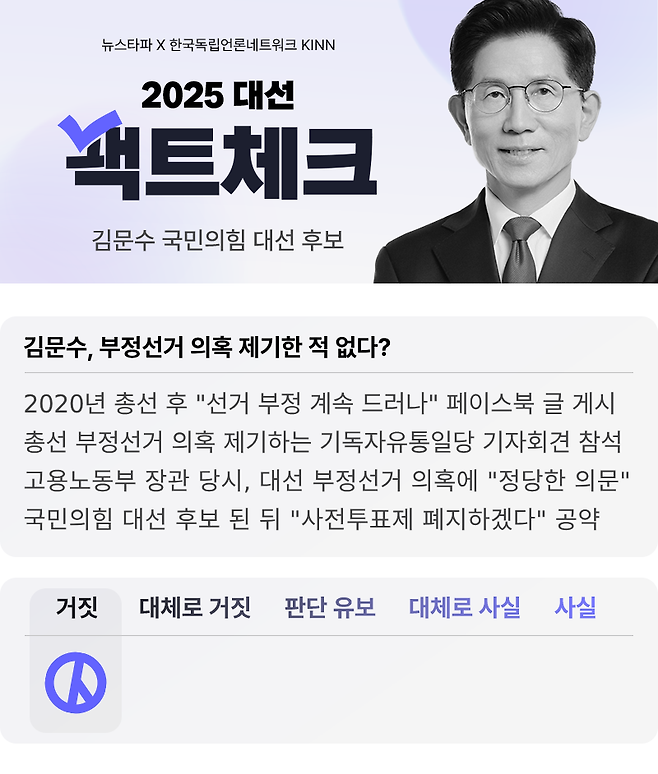 그러나 김문수 후보의 발언은 거짓이다. 뉴스타파가 확인해 보니 김 후보는 지난 2022년 대선은 물론, 5년 전 4.15 총선 때부터 최근까지 부정선거 의혹을 꾸준히 제기해 오고 있다.