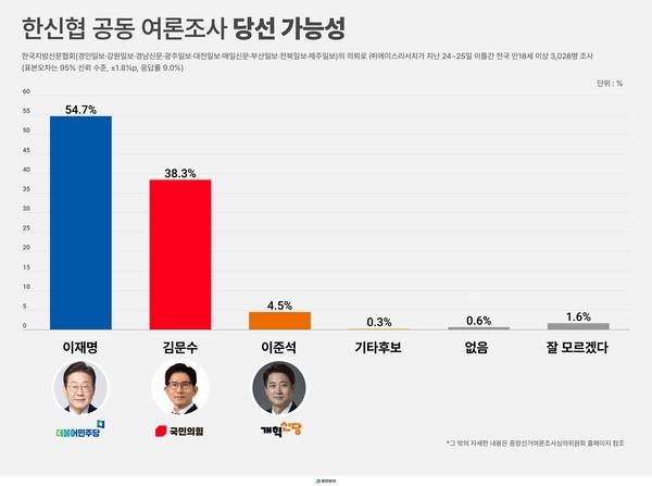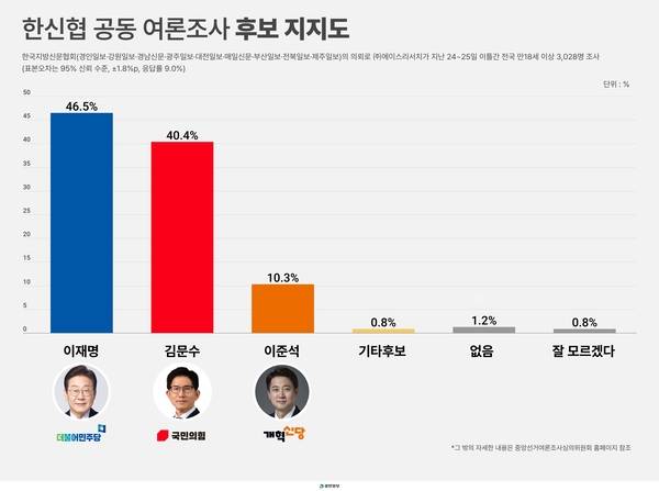 경인일보 등 전국 유력 지방 언론사들로 구성된 한국지방신문협회가 여론조사 전문기관 에이스리서치에 의뢰해 지난 24~25일 이틀간 전국 성인 3천28명을 대상으로 ‘제21대 대통령 선거에 대한 국민 여론조사’를 실시한 결과 후보 지지도는 이재명 후보가 46.5%, 김문수 후보는 40.4%, 이준석 개혁신당 후보는 10.3%를 기록했다.