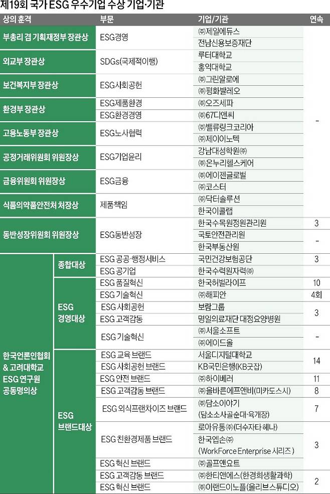 ESG 확산 그림 공모전에서는 한소정 양(경주계림중 2학년)이 최우수상을 받았다. 김지원 양(안양여자고 3학년)과 박고은 양(오산고현초 2학년)이 우수상을, 김아현 양(경해여자중 3학년), 안소민 양(오산고현초 3학년), 황주하 양(대전한밭초 4학년)이 장려상을 받았다. 국가 ESG 우수기업 포상에서는 제일에듀스, 전남신용보증재단, 그린알로에, 평화발레오, 67디앤씨, 강남대성학원, 코스터, 온누리헬스케어, KB국민은행, 서울디지털대학교 등 37개 기업 및 기관이 수상의 영예를 안았다.
