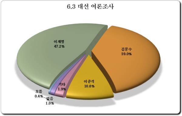 6.3 대선 여론조사...이재명 47.2%, 김문수 39.0%, 이준석 10.6% [한양경제]