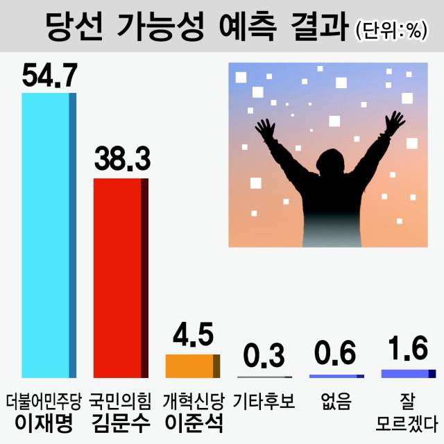 ‘당선 가능성’ 이재명 54.7% 김문수 38.3% 이준석 4.5% [한신협 여론조사]