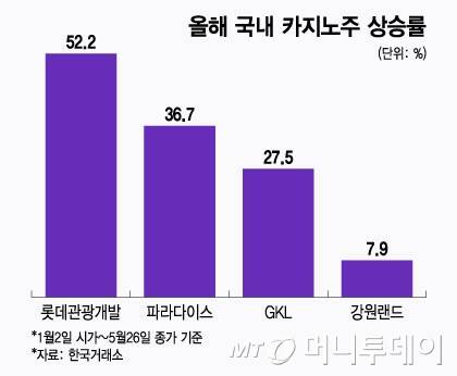 이 밖에도 GKL(27.5%), 파라다이스 (36.7%), 강원랜드 (7.9%) 등 국내 카지노주 모두 연초 대비 오름폭이 컸다. 한국을 방문하는 외국인 관광객 수가 증가하면서 국내 카지노를 찾는 외국인 또한 덩달아 늘어난 덕택이다.