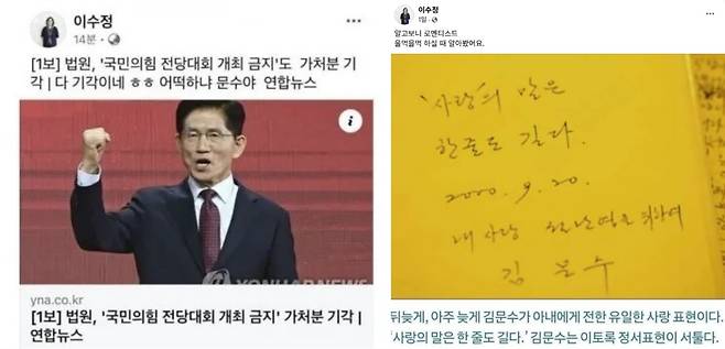 | ▲ 이수정 국민의힘 경기 수원정 당협위원장이 페이스북에 올린 글과 사진 |
