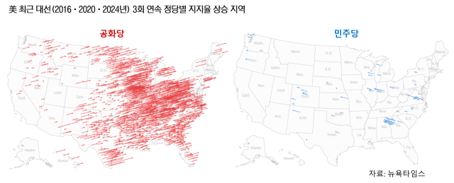 NYT의 미국 대선 득표율 분석에서도 민주당에 대한 표심 이탈이 두드러졌다. 트럼프 대통령이 출마한 2016·2020·2024 년 3번의 선거에서 연속으로 공화당 지지율이 오른 지역구(County)는 전체 3100여곳 중 1433곳이나 됐다. 반면 같은 기간 민주당의 지지율 상승 카운티는 57곳에 그쳤다. 공화당 지지율이 3회 연속 상승한 지역에는 약 4270만 명이 거주하는 반면, 민주당 우세 지역에는 810만 명만 살고 있어 인구 규모에서도 5배 이상 차이가 났다. 민주당이 대다수 유권자를 대변하는 ‘전국정당’에서 점점 지지 기반이 침식돼 ‘도시 엘리트 정당’으로 전락할 수 있음을 시사하는 결과다. 셴커 오소리오는 “지금의 민주당 유권자들은 당이 자아성찰보다 행동해주길 바라고 있다"며 “유권자들은 (당이) 실제로 그들을 위해 싸워주길 갈망하고 있다”고 말했다.