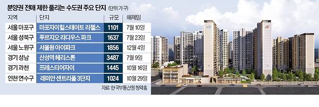 26일 업계에 따르면 투기과열지구인 서울 강남 3구(강남·서초·송파구)와 용산구는 분양권 전매 제한이 3년, 과밀억제권역(서울·인천·경기 일부)은 1년이 적용된다. 한국부동산원 청약홈에 따르면 마포구 공덕동 마포자이힐스테이트 라첼스(1101가구)는 오는 7월 10일 분양권 전매 제한이 풀린다. 지난해 250가구 모집에 4만988명이 몰려 1순위 경쟁률이 164 대 1에 달한 곳이다. 평지인 데다 지하철 5호선 애오개역과 가까워 관심이 크다.