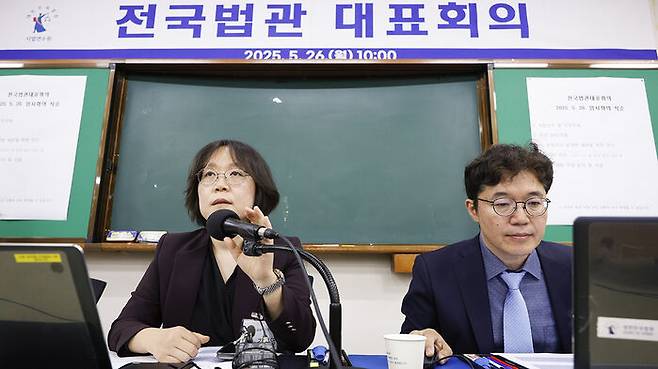 ▲ 김예영 전국법관대표회의 의장(왼쪽)이 26일 경기 고양시 사법연수원에서 열린 전국법관대표회의 임시회의에서 개회 선언을 하고 있다.