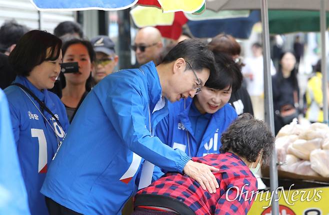 | ▲ 더불어민주당 이재명 대선후보의 김경수 총괄선대위원장, 26일 경남 고성장 앞 유세. |