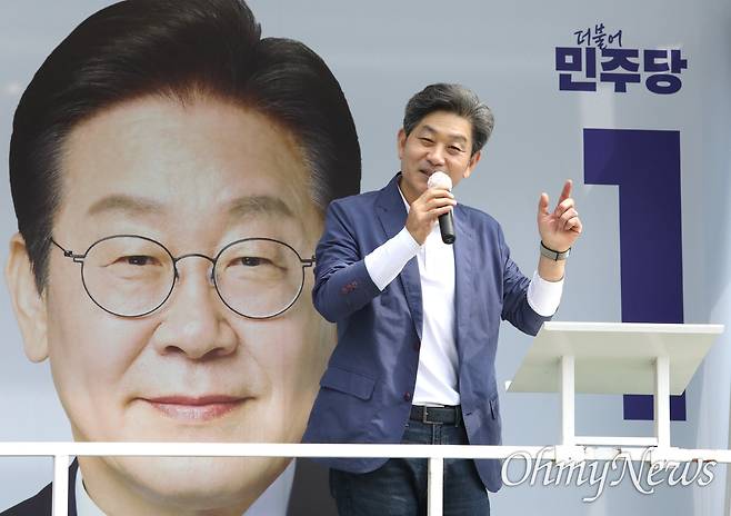 | ▲ 더불어민주당 이재명 대선후보의 이옥철 전 경남도의원, 26일 경남 고성장 앞 유세. |