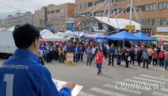 | ▲ 더불어민주당 이재명 대선후보의 백두현 전 고성군수, 26일 경남 고성장 앞 유세. |