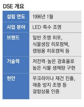 1996년 설립된 DSE는 LED를 활용한 조명 제품 생산과 유통망을 갖춘 중소기업으로 조명 브랜드 '히포(Hippo)' 등을 보유하고 있다. 또 식물생장용 LED 조명 히포팜텍을 비롯해 캠핑용 조명 히포캠픽, 가정용 살균기 히포씨저, 동물용 조명 무럭 등 다양한 특수 조명 제품을 만든다.