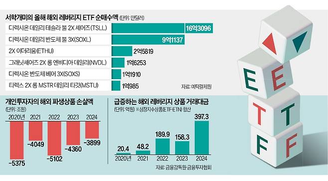 올 들어 국내외 증시가 지지부진한 가운데 해외 고위험 상품에 투자하는 서학개미가 늘고 있다. 레버리지 효과가 큰 상장지수상품(ETP) 등으로 한 방을 노리는 수요가 커졌다는 얘기다. 금융당국은 이런 고위험 상품 투자에 따른 손실이 매년 수천억원에 달하는 점을 들어 진입 규제를 강화하기로 했다.