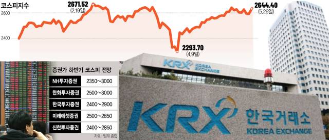26일 금융투자 업계에 따르면 국내 주요 증권사들은 올해 하반기 코스피가 반등에 성공해 최고 3000포인트까지 오를 수 있을 것으로 내다봤다. NH투자증권은 이날 보고서를 내고 코스피 전망치 범위를 2350포인트에서 3000포인트로 제시했다. 한화투자증권은 2500~3000포인트, 한국투자증권은 2400~2900포인트까지 상승할 수 있다고 전망했다. 미래에셋증권(2500~2850포인트)과 신한투자증권(2400~2850포인트)도 코스피가 박스권을 뚫고 올라갈 것으로 봤다. 다만 상단과 하단 범위가 500포인트에서 최대 650포인트까지 제시된 걸 두고 증권사들이 전망치 오류를 의식해 지나치게 넓게 잡은 것 아니냐는 비판도 있다. 코스피가 3000포인트를 웃돌았던 것은 2021년 12월이 마지막이다. 이날 코스피는 전 거래일 대비 52.31포인트(2.02%) 오른 2644.40에 마감했다.